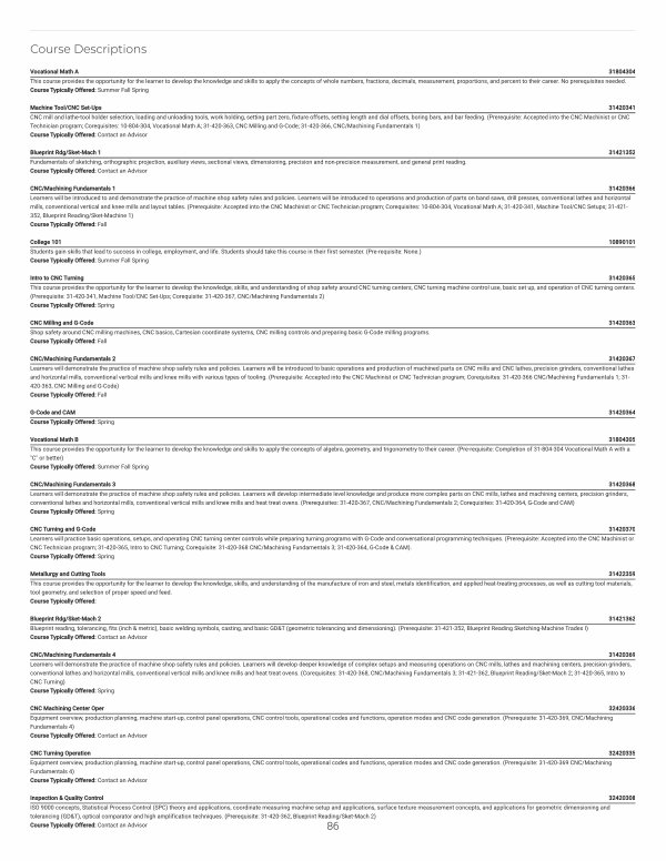 CNC / Machining Fundamentals 1 31420366 Learners will be introduced to and demonstrate the practice of machine shop safety rules and policies. Learners will be introduced to operations and production of parts on band saws, drill presses, conventional lathes and horizontal mills, conventional vertical and knee mills and layout tables.( Prerequisite: Accepted into the CNC Machinist or CNC Technician program; Corequisites: 10-804-304, Vocational Math A; 31-420-341, Machine Tool / CNC Setups; 31-421- 352, Blueprint Reading / Sket-Machine 1) Course Typically Offered: Fall
