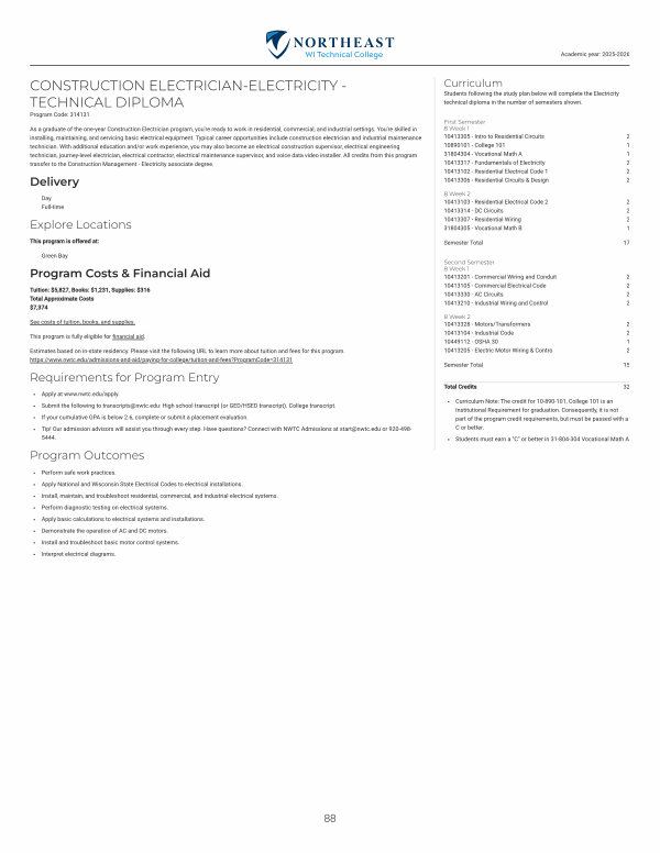 Perform safe work practices. Apply National and Wisconsin State Electrical Codes to electrical installations. Install, maintain, and troubleshoot residential, commercial, and industrial electrical systems. Perform diagnostic testing on electrical systems. Apply basic calculations to electrical systems and installations. Demonstrate the operation of AC and DC motors. Install and troubleshoot basic motor control systems. Interpret electrical diagrams.