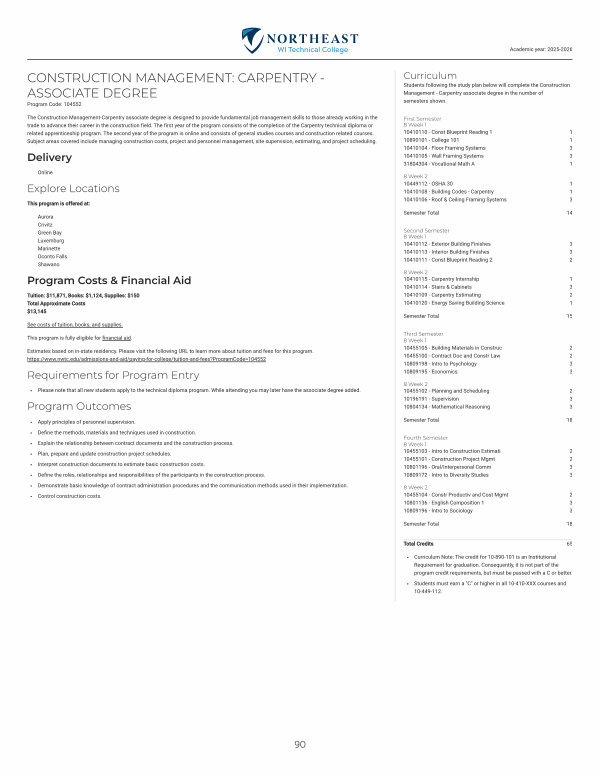 The Construction Management-Carpentry associate degree is designed to provide fundamental job management skills to those already working in the trade to advance their career in the construction field. The first year of the program consists of the completion of the Carpentry technical diploma or related apprenticeship program. The second year of the program is online and consists of general studies courses and construction related courses. Subject areas covered include managing construction costs, project and personnel management, site supervision, estimating, and project scheduling.