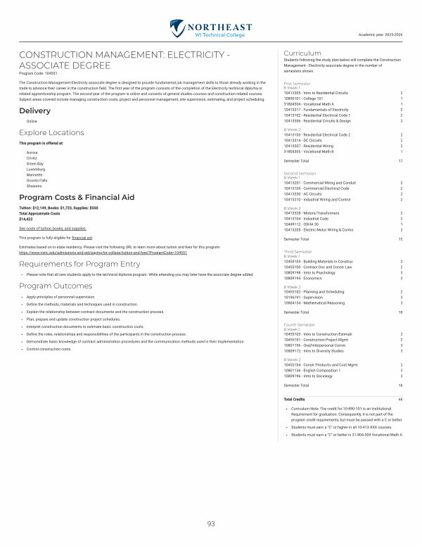 The Construction Management-Electricity associate degree is designed to provide fundamental job management skills to those already working in the trade to advance their career in the construction field. The first year of the program consists of the completion of the Electricity technical diploma or related apprenticeship program. The second year of the program is online and consists of general studies courses and construction related courses. Subject areas covered include managing construction costs, project and personnel management, site supervision, estimating, and project scheduling.