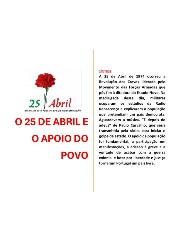 SÍNTESE A 25 de Abril de 1974 ocorreu a Revolução dos Cravos liderada pelo Movimento das Forças Armadas que pôs fim à ditadura do Estado Novo . Na madrugada desse dia , militares ocuparam os estúdios da Rádio Renascença e explicaram à população que pretendiam um país democrata . Aguardavam a música , “ E depois do adeus ” de Paulo Carvalho , que seria transmitida pela rádio , para iniciar o golpe de estado . O apoio da população foi fundamental , a participação em manifestações , a adesão à greve e a vontade de acabar com a guerra colonial e lutar por liberdade e justiça tornaram Portugal um país livre .