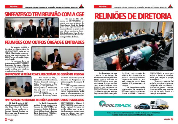 Em maio de 2016, a Diretoria do SINFFAZFISCO se reuniu com representantes da Controladoria Geral do Estado para tratar especificamente de assuntos referentes ao projeto de lei que, à época, tramitava na Assembleia Legislativa de Minas Gerais e tratava da reestruturação da Administração Pública do Estado.