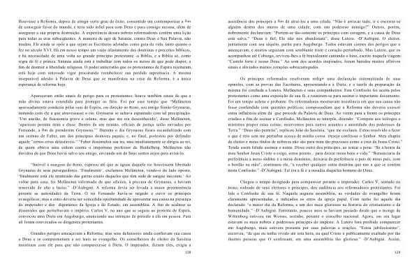 Os príncipes reformados resolveram redigir uma declaração sistematizada de suas opiniões , com as provas das Escrituras , apresentando-a à Dieta ; e a tarefa da preparação da mesma foi confiada a Lutero , Melâncton e seus companheiros . Esta Confissão foi aceita pelos protestantes como uma exposição de sua fé , e reuniram-se para assinar o importante documento . Foi um tempo solene e probante . Os reformadores mostravam insistência em que sua causa não fosse confundida com questões políticas ; compreendiam que a Reforma não deveria exercer outra influência além da que procede da Palavra de Deus . Ao virem para a frente os príncipes cristãos a fim de assinar a Confissão , Melâncton se interpôs , dizendo : “ Compete aos teólogos e ministros propor estas coisas ; reservemos para outros assuntos a autoridade dos poderosos da Terra .” “ Deus não permita ”, replicou João da Saxônia , “ que me excluais . Estou resolvido a fazer o que é reto sem me perturbar acerca de minha coroa . Desejo confessar o Senhor . Meu chapéu de eleitor e meus títulos de nobreza não são para mim tão preciosos como a cruz de Jesus Cristo .” Tendo assim falado assinou o nome . Disse outro dos príncipes , ao tomar a pena : “ Se a honra de meu Senhor Jesus Cristo o exige , estou pronto ... para deixar meus bens e vida .” “ Renunciaria de preferência a meus súditos e a meus domínios , deixaria de preferência o país de meus pais , com o bordão na mão ”, continuou ele , “ a receber qualquer outra doutrina que não a que se contém nesta Confissão .” -D ’ Aubigné . Tal era a fé e a ousadia daqueles homens de Deus .