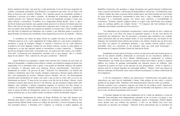 “ Os elaboradores da Constituição reconheceram o eterno princípio de que a relação do homem para com o seu Deus está acima de legislação humana , e de que seus direitos de consciência são inalienáveis . Não foi necessário o raciocínio para estabelecer esta verdade ; temos consciência dela em nosso próprio íntimo . É essa consciência que , em desafio às leis humanas , tem sustentado tantos mártires nas torturas e nas chamas . Sentiam que seu dever para com Deus era superior às ordenanças humanas , e que nenhum homem poderia exercer autoridade sobre sua consciência . É um princípio inato que nada pode desarraigar .” - Documentos do Congresso ( Estados Unidos da América do Norte ).