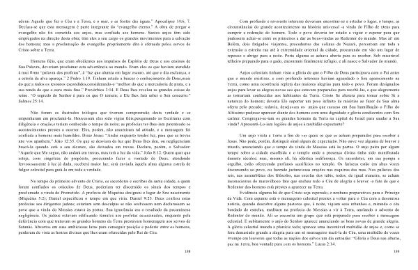 Evidência alguma há de que Cristo seja esperado , e nenhuns preparativos para o Príncipe da Vida . Com espanto está o mensageiro celestial prestes a voltar para o Céu com a desonrosa notícia , quando descobre alguns pastores que , à noite , vigiam seus rebanhos e , mirando o céu bordado de estrelas , meditam na profecia do Messias a vir à Terra , anelando o advento do Redentor do mundo . Ali se encontra um grupo que está preparado para receber a mensagem celestial . E subitamente o anjo do Senhor aparece anunciando as boas novas de grande alegria . A glória celestial inunda a planície toda ; aparece uma incontável multidão de anjos e , como se fora demasiado grande a alegria para um só mensageiro trazê-la do Céu , uma multidão de vozes irrompe em louvores que todas as nações dos salvos um dia entoarão : “ Glória a Deus nas alturas , paz na Terra , boa vontade para com os homens .” Lucas 2:14 .