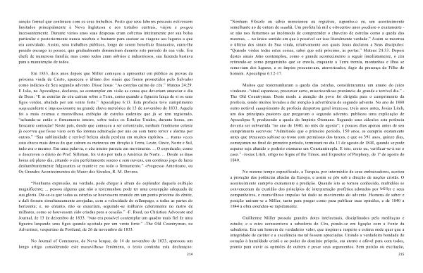 Muitos que testemunharam a queda das estrelas , consideraramna um arauto do juízo vindouro - “ sinal espantoso , precursor certo , misericordioso prenúncio do grande e terrível dia .” - The Old Countryman . Deste modo a atenção do povo foi dirigida para o cumprimento da profecia , sendo muitos levados a dar atenção à advertência do segundo advento . No ano de 1840 outro notável cumprimento de profecia despertou geral interesse . Dois anos antes , Josias Litch , um dos principais pastores que pregavam o segundo advento , publicou uma explicação de Apocalipse 9 , predizendo a queda do Império Otomano . Segundo seus cálculos esta potência deveria ser subvertida “ no ano de 1840 , no mês de agosto ”; e poucos dias apenas antes de seu cumprimento escreveu : “ Admitindo que o primeiro período , 150 anos , se cumpriu exatamente antes que Deacozes subisse ao trono com permissão dos turcos , e que os 391 anos , quinze dias , começaram no final do primeiro período , terminará no dia 11 de agosto de 1840 , quando se pode esperar seja abatido o poderio otomano em Constantinopla . E isto , creio eu , verificar-se-á ser o caso .” -Josias Litch , artigo no Signs of the Times , and Expositor of Prophecy , de 1 º de agosto de 1840 .