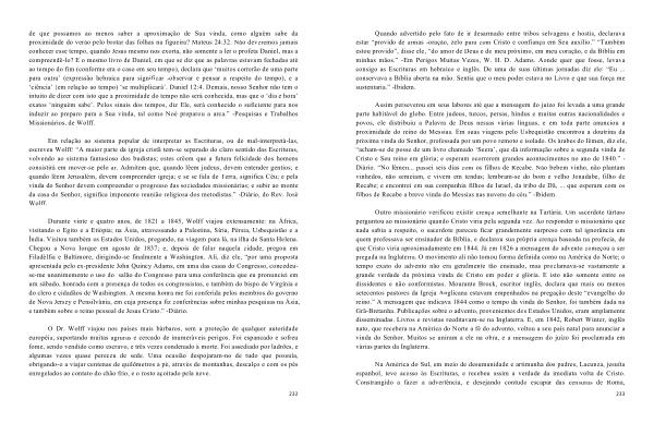 Durante vinte e quatro anos , de 1821 a 1845 , Wolff viajou extensamente : na África , visitando o Egito e a Etiópia ; na Ásia , atravessando a Palestina , Síria , Pérsia , Usbequistão e a Índia . Visitou também os Estados Unidos , pregando , na viagem para lá , na ilha de Santa Helena . Chegou a Nova Iorque em agosto de 1837 ; e , depois de falar naquela cidade , pregou em Filadélfia e Baltimore , dirigindo-se finalmente a Washington . Ali , diz ele , “ por uma proposta apresentada pelo ex-presidente John Quincy Adams , em uma das casas do Congresso , concedeuse-me unanimemente o uso do salão do Congresso para uma conferência que eu pronunciei em um sábado , honrada com a presença de todos os congressistas , e também do bispo de Virgínia e do clero e cidadãos de Washington . A mesma honra me foi conferida pelos membros do governo de Nova Jersey e Pensilvânia , em cuja presença fiz conferências sobre minhas pesquisas na Ásia , e também sobre o reino pessoal de Jesus Cristo .” -Diário .