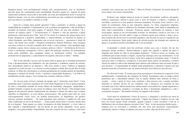 Diz Howard Crosby : “ É assunto para séria preocupação o encontrarmos a igreja de Cristo negligenciando o cumprimento dos desígnios do Senhor . Exatamente como os antigos judeus permitiram que o intercâmbio familiar com as nações idólatras lhes roubasse de Deus o coração , ... assim a igreja de Jesus , hoje , mediante a falsa parceria com o mundo incrédulo , abandona os métodos divinos de sua verdadeira vida e entrega-se aos costumes de uma sociedade sem Cristo -hábitos perniciosos embora muitas vezes plausíveis -usando argumentos e chegando a conclusões , estranhos à revelação de Deus e diretamente antagônicos a todo o crescimento em graça .” -The Health Christian , An Appeal to the Church .