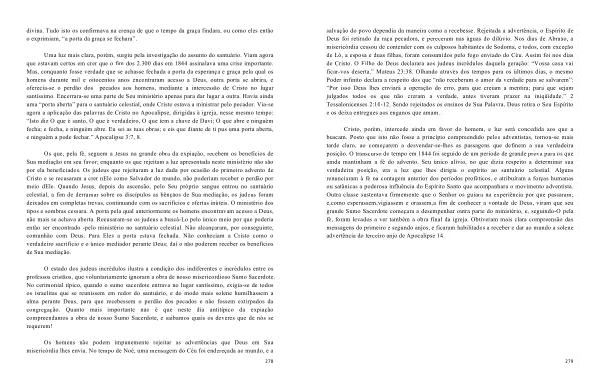 Uma luz mais clara , porém , surgiu pela investigação do assunto do santuário . Viam agora que estavam certos em crer que o fim dos 2.300 dias em 1844 assinalava uma crise importante . Mas , conquanto fosse verdade que se achasse fechada a porta da esperança e graça pela qual os homens durante mil e oitocentos anos encontraram acesso a Deus , outra porta se abrira , e oferecia-se o perdão dos pecados aos homens , mediante a intercessão de Cristo no lugar santíssimo . Encerrara-se uma parte de Seu ministério apenas para dar lugar a outra . Havia ainda uma “ porta aberta ” para o santuário celestial , onde Cristo estava a ministrar pelo pecador . Via-se agora a aplicação das palavras de Cristo no Apocalipse , dirigidas à igreja , nesse mesmo tempo : “ Isto diz O que é santo , O que é verdadeiro , O que tem a chave de Davi ; O que abre e ninguém fecha ; e fecha , e ninguém abre . Eu sei as tuas obras ; e eis que diante de ti pus uma porta aberta , e ninguém a pode fechar .” Apocalipse 3:7 , 8 .