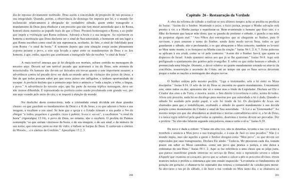 De novo é dada a ordem : “ Clama em alta voz , não te detenhas , levanta a tua voz como a trombeta e anuncia a Meu povo a sua transgressão , e à casa de Jacó os seus pecados .” Não é o mundo ímpio , mas são aqueles a quem o Senhor designa como “ Meu povo ”, os que devem ser reprovados por suas transgressões . Declara Ele ainda : “ Todavia , Me procuram cada dia , tomam prazer em saber os Meus caminhos , como um povo que pratica a justiça , e não deixa a ordenança do seu Deus .” Isaías 58:1 , 2 . Aqui se faz referência a uma classe que se julga justa , que parece manifestar grande interesse no serviço de Deus ; mas a repreensão severa e solene dAquele que examina os corações , prova que se acham a calcar a pés os preceitos divinos . Desta maneira indica o profeta a ordenança que tem estado esquecida : “ Levantarás os fundamentos de geração em geração ; e chamar-te-ão reparador das roturas , e restaurador de veredas para morar . Se desviares o teu pé do sábado , e de fazer a tua vontade no Meu santo dia , e se chamares ao