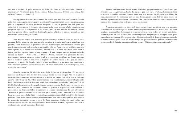 Satanás está bem ciente de que a mais débil alma que permaneça em Cristo é mais que suficiente para competir com as hostes das trevas , e que , caso ele se revelasse abertamente , seria enfrentado e vencido . Portanto , procura retirar das suas potentes fortificações os soldados da cruz , enquanto jaz de emboscada com as suas forças , pronto para destruir todos os que se arriscam a penetrar em seu terreno . Unicamente com humilde confiança em Deus , e obediência a todos os Seus mandamentos , poderemos achar-nos seguros .