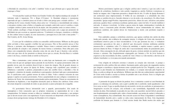 Muitos protestantes supõem que a religião católica não é atrativa , e que seu culto é um conjunto de cerimônias , fastidioso e sem sentido . Enganam-se , porém . Embora o romanismo se baseie no engano , não é impostura grosseira e desprovida de arte . O culto da Igreja Romana é um cerimonial assaz impressionante . O brilho de sua ostentação e a solenidade dos ritos fascinam os sentidos do povo , fazendo silenciar a voz da razão e da consciência . Os olhos ficam encantados . Igrejas magnificentes , imponentes procissões , altares de ouro , relicários com pedras preciosas , quadros finos e artísticas esculturas apelam para o amor do belo . O ouvido também é cativado . A música é excelente . As belas e graves notas do órgão , misturandose à melodia de muitas vozes a ressoarem pelas elevadas abóbadas e naves ornamentadas de colunas , das grandiosas catedrais , não podem deixar de impressionar a mente com profundo respeito e reverência .