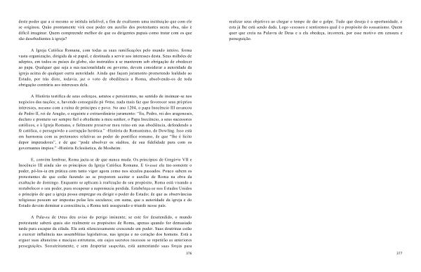 realizar seus objetivos ao chegar o tempo de dar o golpe . Tudo que deseja é a oportunidade , e esta já lhe está sendo dada . Logo veremos e sentiremos qual é o propósito do romanismo . Quem quer que creia na Palavra de Deus e a ela obedeça , incorrerá , por esse motivo em censura e perseguição .