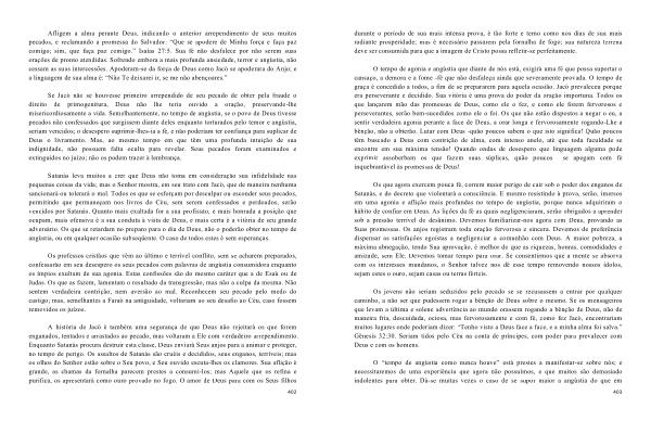 Os que agora exercem pouca fé , correm maior perigo de cair sob o poder dos enganos de Satanás , e do decreto que violentará a consciência . E mesmo resistindo à prova , serão , imersos em uma agonia e aflição mais profundas no tempo de angústia , porque nunca adquiriram o hábito de confiar em Deus . As lições da fé as quais negligenciaram , serão obrigados a aprender sob a pressão terrível do desânimo . Devemos familiarizar-nos agora com Deus , provando as Suas promessas . Os anjos registram toda oração fervorosa e sincera . Devemos de preferência dispensar as satisfações egoístas a negligenciar a comunhão com Deus . A maior pobreza , a máxima abnegação , tendo Sua aprovação , é melhor do que as riquezas , honras , comodidades e amizade , sem Ele . Devemos tomar tempo para orar . Se consentirmos que a mente se absorva com os interesses mundanos , o Senhor talvez nos dê esse tempo removendo nossos ídolos , sejam estes o ouro , sejam casas ou terras férteis .