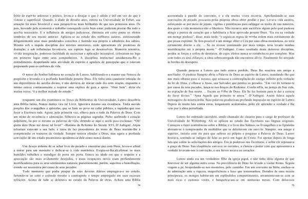 Enquanto um dia examinava os livros da Biblioteca da Universidade , Lutero descobriu uma Bíblia latina . Nunca dantes vira tal Livro . Ignorava mesmo sua existência . Tinha ouvido porções dos evangelhos e epístolas , que se liam ao povo no culto público , e supunha que isso fosse a Escritura toda . Agora , pela primeira vez , olhava para o todo da Palavra de Deus . Com um misto de reverência e admiração , folheava as páginas sagradas . Pulso acelerado e coração palpitante , lia por si mesmo as palavras de vida , detendo-se aqui e acolá para exclamar : “ Oh ! quem dera Deus me desse tal livro !” -História da Reforma do Século XVI , D ’ Aubigné . Anjos celestiais estavam a seu lado , e raios de luz procedentes do trono de Deus traziam-lhe à compreensão os tesouros da verdade . Sempre temera ofender a Deus , mas agora a profunda convicção de seu estado pecaminoso apoderou-se dele como nunca dantes .
