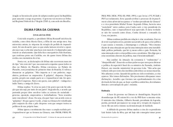 PRB, PSD, DEM, PTB, SD, PSB e PPS, o que levou o PT, PCdoB e PDT ao isolamento. Erra quando atribui o processo de impeachment a dois adversários apenas: o“ senhor presidente da Câmara” e o vice-presidente Michel Temer. Segundo Dilma, haveria uma“ sociedade” entre ambos, pois Cunha será o vice-presidente da República, caso o impeachment seja aprovado. É meia verdade: se não for cassado antes disso, Cunha deixará o comando da Casa, em janeiro.