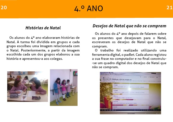 Os alunos do 4º ano elaboraram histórias de Natal. A turma foi dividida em grupos e cada grupo escolheu uma imagem relacionada com o Natal. Posteriormente, a partir da imagem escolhida cada um dos grupos elaborou a sua história e apresentou-a aos colegas.