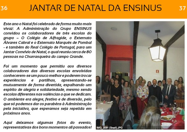 Este ano o Natal foi celebrado de forma muito mais vivaz: A Administração do Grupo ENSINUS convidou os colaboradores de três escolas do grupo – O Colégio de Alfragide, o Externato Álvares Cabral e o Externato Marquês de Pombal - e também do Real Colégio de Portugal, para um Jantar Convívio de Natal, o qual reuniu cerca de 80 pessoas na Churrasqueira do campo Grande.