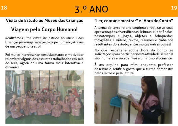 A turma do terceiro ano continua a realizar as suas apresentações diversificadas: leituras, experiências, passatempos e jogos, objetos e brinquedos, fotografias e vídeos, textos, resumos e trabalhos resultantes do estudo, entre muitas outras coisas!
