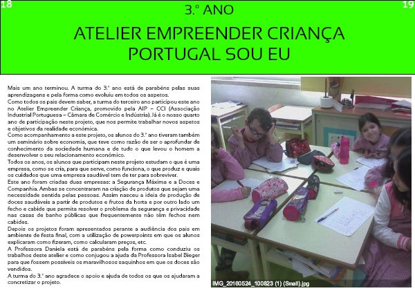 Como todos os pais devem saber, a turma do terceiro ano participou este ano no Atelier Empreender Criança, promovido pela AIP – CCI (Associação Industrial Portuguesa – Câmara de Comércio e Indústria). Já é o nosso quarto ano de participação neste projeto, que nos permite trabalhar novos aspetos e objetivos da realidade económica.
