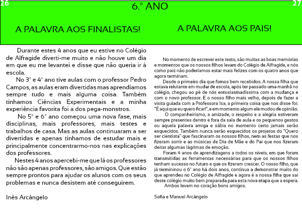 Foram 4 anos de aprendizagens a todos os níveis, em que foram transmitidas as ferramentas necessárias para que os nossos filhos tenham sucesso no futuro e que os fizeram crescer. O nosso filho, que já termininou o 6º ano há dois anos, continua a demonstrar muito do que aprendeu no Colégio de Alfragide e agora é a nossa filha que sai deste colégio muito bem preparada para esta nova etapa que a espera.