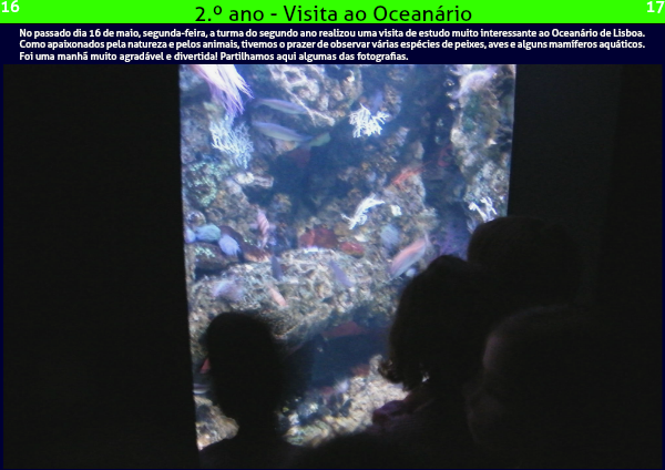No passado dia 16 de maio, segunda-feira, a turma do segundo ano realizou uma visita de estudo muito interessante ao Oceanário de Lisboa. Como apaixonados pela natureza e pelos animais, tivemos o prazer de observar várias espécies de peixes, aves e alguns mamíferos aquáticos.