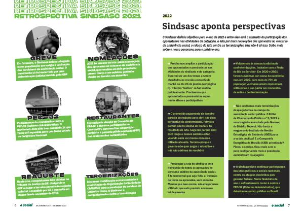 O Sindsasc definiu objetivos para o ano de 2022 e entre eles está o aumento da participação dos aposentados nas atividades da categoria , a luta por mais nomeações dos aprovados no concurso da assistência social , o reforço da luta contra as terceirizações . Mas não é só isso . Saiba mais sobre o nosso panorama para o próximo ano .