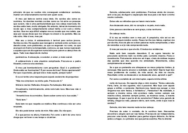O meu pai bate-se contra essa ideia. Os surdos são como os ouvintes, há doentes mentais surdos como os há entre as pessoas que ouvem, não é uma particularidade que nos esteja reservada. Os surdos estão bem, muito obrigada. No entanto, talvez de momento ele receie que o meu comportamento actual tenha a ver com a minha surdez. Que me seja difícil adaptar-me ao mundo que me rodeia, que seja por causa disso que me refugio no álcool e na paródia. Mas eu não acho. Não é isso, meu pai.