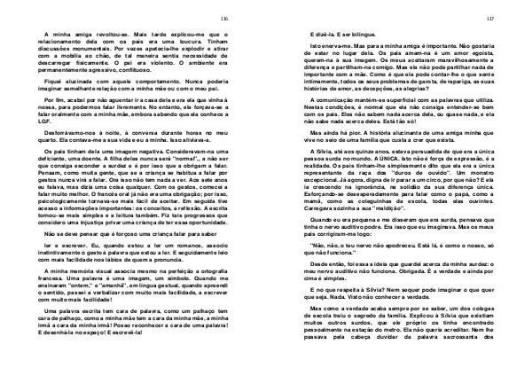A Sílvia, até aos quinze anos, estava persuadida de que era a única pessoa surda no mundo. A ÚNICA. Isto não é força de expressão, é a realidade. Os pais tinham-lhe simplesmente dito que ela era a única representante da raça dos " duros de ouvido ". Um monstro excepcional. Já agora, digna de ir parar a um circo, por que não? E ela ia crescendo na ignorância, na solidão da sua diferença única. Esforçando-se desesperadamente para falar como o papá, como a mamã, como as coleguinhas da escola, todas elas ouvintes. Carregava sozinha a sua " maldição ".