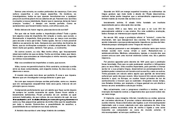 Somos uma minoria, os surdos profundos de nascença. Com uma cultura específica e uma língua específica. Os médicos, os investigadores, todos os que querem transformar-nos a qualquer preço em ouvintes põem-me os cabelos em pé. Fazerem-nos ouvintes é aniquilar a nossa identidade. Querer que à nascença deixe de haver crianças " surdas," é desejar um mundo perfeito. Como se quiséssemos que fossem todos louros, com olhos azuis, etc.