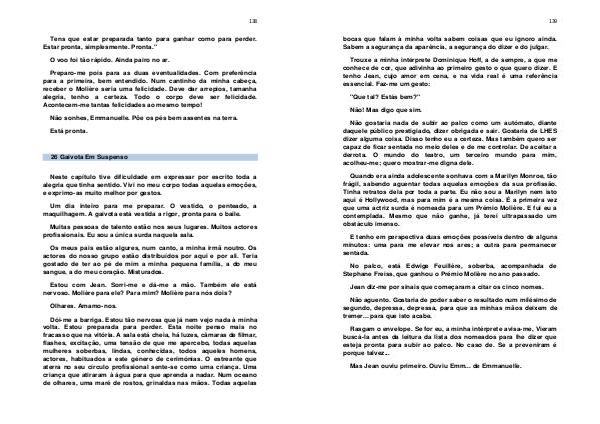Dói-me a barriga. Estou tão nervosa que já nem vejo nada à minha volta. Estou preparada para perder. Esta noite penso mais no fracasso que na vitória. A sala está cheia, há luzes, câmaras de filmar, flashes, excitação, uma tensão de que me apercebo, todas aquelas mulheres soberbas, lindas, conhecidas, todos aqueles homens, actores, habituados a este género de cerimónias. O estreante que aterra no seu círculo profissional sente-se como uma criança. Uma criança que atiraram à água para que aprenda a nadar. Num oceano de olhares, uma maré de rostos, grinaldas nas mãos. Todas aquelas