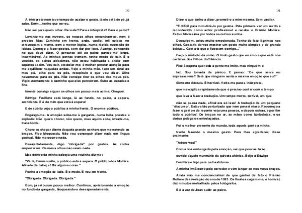 Choro ao chegar diante daquela grande senhora que me estende os braços. Fico bloqueada. Não vou conseguir dizer nada em língua gestual. Não me ocorre nada.