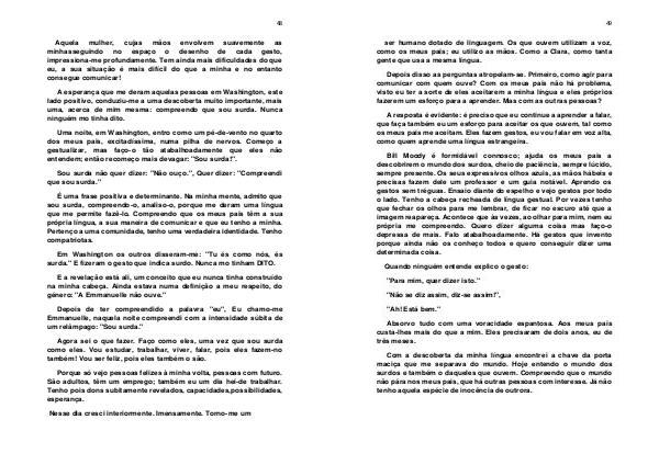 Agora sei o que fazer. Faço como eles, uma vez que sou surda como eles. Vou estudar, trabalhar, viver, falar, pois eles fazem-no também! Vou ser feliz, pois eles também o são.