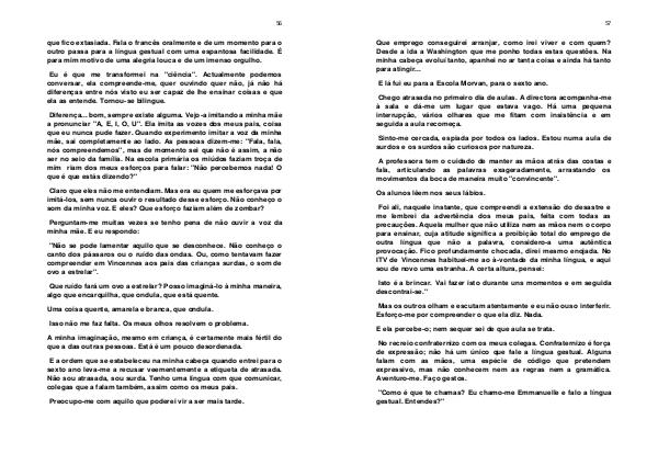 que fico extasiada. Fala o francês oralmente e de um momento para o outro passa para a língua gestual com uma espantosa facilidade. É para mim motivo de uma alegria louca e de um imenso orgulho.