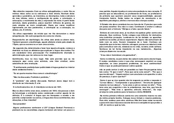 Na minha primeira infância sentia-me uma estranha mesmo no seio da minha própria família. Colegas meus tinham o mesmo problema. Para mim, acabou; para eles, continua. Não têm boas notas na escola e para mim esse insucesso escolar deve-se à estúpida lei que proibe a LSF, lei contra a qual eu luto.