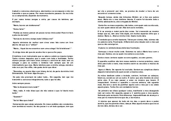 O telefone é um instrumento que eu adoro e odeio ao mesmo tempo. Tenho ciúmes daqueles que o usam com toda a facilidade. Tenho ciúmes porque aos treze anos começa a conviver-se mais com as colegas e para os surdos o telefone tem sempre que ter um intermediário que oiça. Maria telefona para a minha colega, atende a mãe ou o pai, fica aflita, não gosta de ter que dizer: