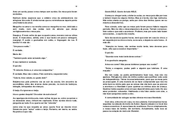 Ele tem razão, eu podia perfeitamente fazer isso, mas não me apetece. Refugio-me atrás da minha surdez para justificar esta sede de independência. Talvez inconscientemente, para que os meus pais se preocupem. É uma maneira de os fazer compreender que não me sinto bem na minha pele, que as coisas não vão bem, que se procuro a aventura e a liberdade é para queimar as minhas asas de criança. Queimar todos aqueles anos em que dependi deles para tudo. Do seu amor protector, educador. Habituada a não falar senão com eles, a não fazer perguntas senão a eles.
