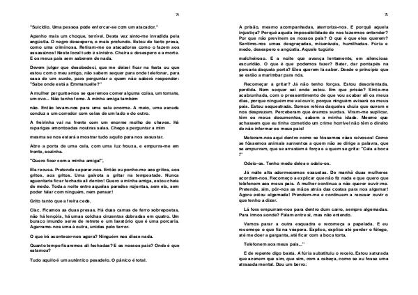 Clac. Ficamos as duas presas. Há duas camas de ferro sobrepostas, não há lençóis, há umas colchas cinzentas dobradas em quatro. Um buraco imundo serve de retrete e um lavatório que é uma porcaria. Agarramo-nos uma à outra, unidas pelo terror.