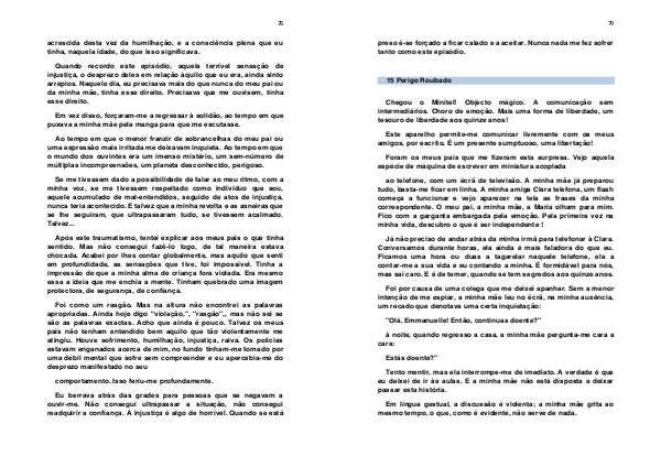 Após este traumatismo, tentei explicar aos meus pais o que tinha sentido. Mas não consegui fazê-lo logo, de tal maneira estava chocada. Acabei por lhes contar globalmente, mas aquilo que senti em profundidade, as sensações que tive, foi impossível. Tinha a impressão de que a minha alma de criança fora violada. Era mesmo essa a ideia que me enchia a mente. Tinham quebrado uma imagem protectora, de segurança, de confiança.