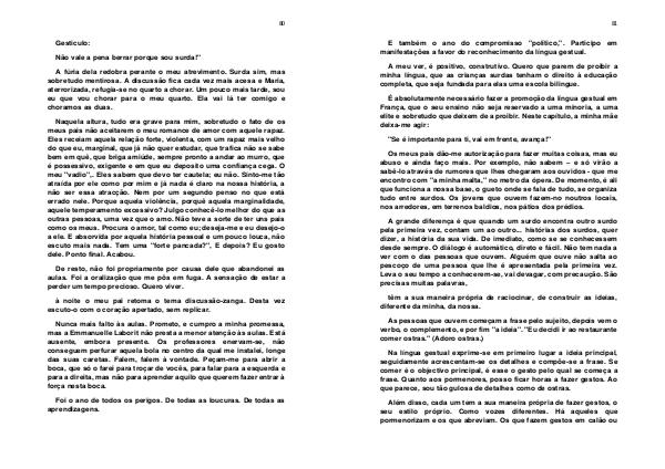 Os meus pais dão-me autorização para fazer muitas coisas, mas eu abuso e ainda faço mais. Por exemplo, não sabem – e só virão a sabê-lo através de rumores que lhes chegaram aos ouvidos- que me encontro com " a minha malta," no metro da ópera. De momento, é ali que funciona a nossa base, o gueto onde se fala de tudo, se organiza tudo entre surdos. Os jovens que ouvem fazem-no noutros locais, nos arredores, em terrenos baldios, nos pátios dos prédios.
