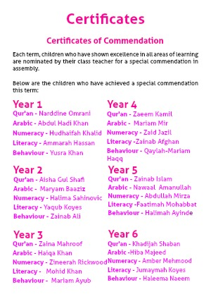 Each term, children who have shown excellence in all areas of learning are nominated by their class teacher for a special commendation in assembly.