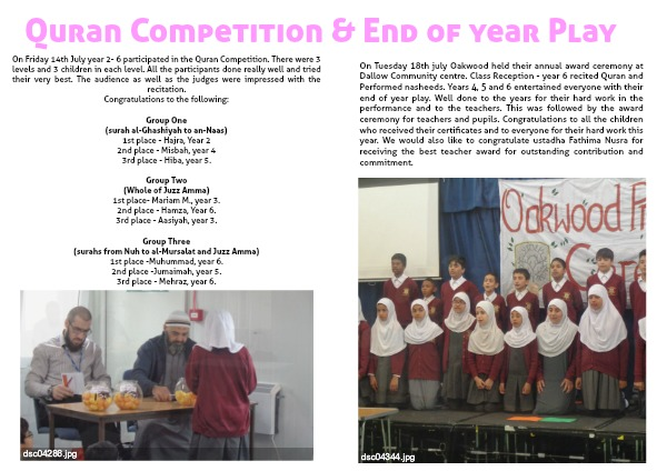 On Friday 14th July year 2- 6 participated in the Quran Competition. There were 3 levels and 3 children in each level. All the participants done really well and tried their very best. The audience as well as the judges were impressed with the recitation.