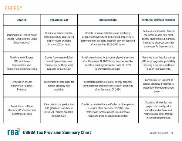 Reduces or eliminates federal tax incentives for new clean energy investments, potentially increasing after-tax costs for businesses in these sectors. |