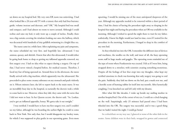 The nurse came in a while later . After explaining my pain and symptoms , the nurse scheduled my very first , and hopefully last , ultrasound . I was anxious , queasy , and skittish . I knew that after this ultrasound , I would either be going back home to sleep or getting my inflamed appendix removed , my first surgery ever . I had no idea what to expect during a surgery . On top of that , I had never visited a hospital before , for medical reasons . Therefore , I faced my fear of being operated on . Around three in the afternoon , the nurse finally arrived with a big machine , which apparently was the ultrasound . She proceeded to place some creamy substance on my stomach and push violently on it . Fifteen minutes later , she left to report back to the main nurse . It was an incredibly busy day in the hospital , so naturally the doctors took a while to come back to me . However , when they did , they came with the news that I did not want to hear . In her Queens accent , the doctor said , “ So , Loukas , you ’ ve got an inflamed appendix , honey . We gotta take it out tonight .”