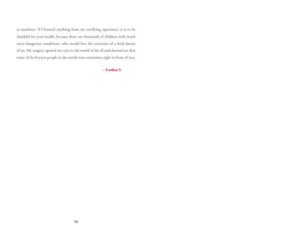 to machines . If I learned anything from my terrifying experience , it is to be thankful for your health , because there are thousands of children with much more dangerous conditions , who would love the sensation of a fresh breeze of air . My surgery opened my eyes to the world of the ill and showed me that some of the bravest people in the world were sometimes right in front of you .