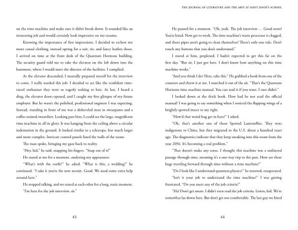 “ That doesn ’ t make any sense . I thought this machine was a unilateral passage through time , meaning it ’ s a one-way trip to the past . How are these bugs traveling forward through time without a time machine ?” “ Do I look like I understand quantum physics ?” he retorted , exasperated . “ Isn ’ t it your job to understand the time machine ?” I was getting frustrated . “ Do you meet any of the job criteria ?” “ Ha ! Don ’ t get smart . I didn ’ t even read the job criteria . Listen , kid . We ’ re somewhat lax down here . But don ’ t get too comfortable . The last guy we hired
