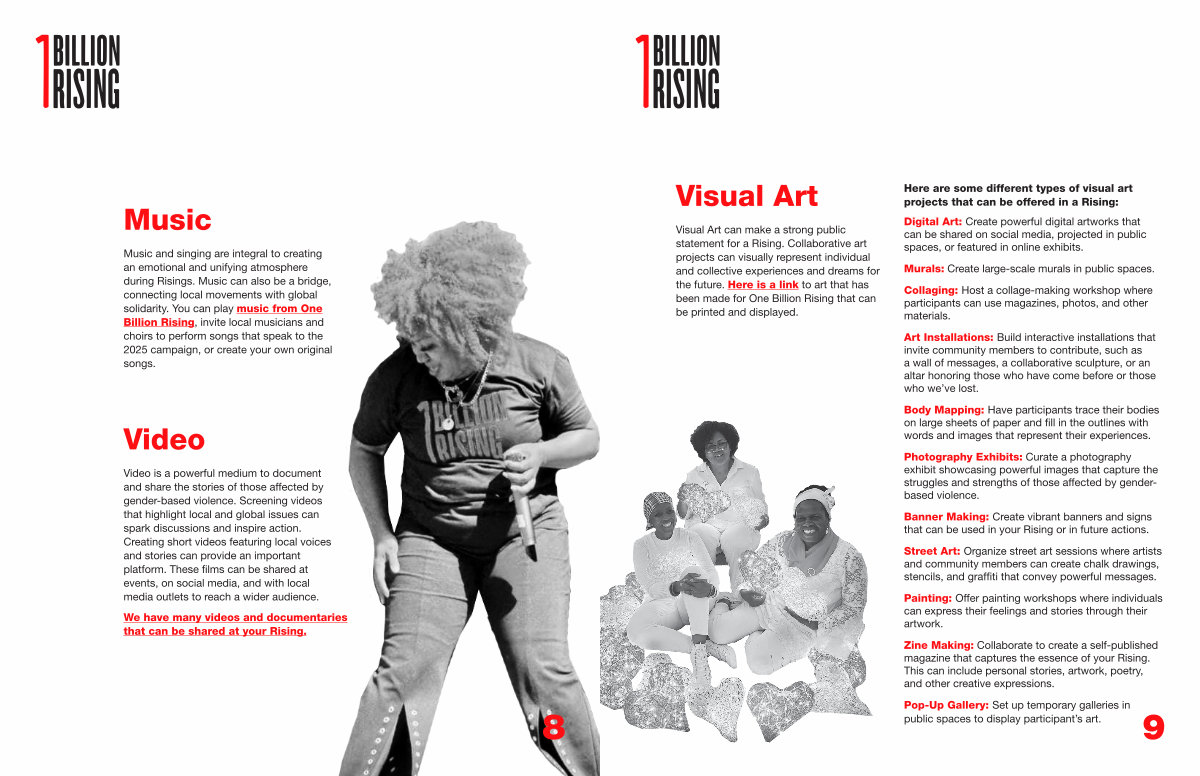 Visual Art can make a strong public statement for a Rising. Collaborative art projects can visually represent individual and collective experiences and dreams for the future. Here is a link to art that has been made for One Billion Rising that can be printed and displayed.