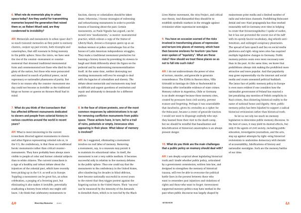 AH : Memorials and monuments in urban space don ’ t so much transmit memories as they point to memory clusters , conjure up past events , both triumphs and catastrophes , that still resonate in living memory in the public sphere . Since the 1990s , we have seen the rise of the counter-monument or countermemorial that shunned traditional monumental form and commemorated not those who died for the glory of the nation , but those who were persecuted and murdered in search of political power , racial supremacy or nationalist phantasms of purity . But there is no reason why the counter-monument one day could not become as invisible as the traditional kings on horses or queens on thrones Musil had in mind . fascism , slavery or colonialism should be taken down . Otherwise , I favour strategies of redressing and refunctioning monuments in order to provide lessons of learning about the past . Certain monuments , as Paolo Vignolo has argued , can be turned into ‘ mockuments ,’ a counter-monumental practice , which colours a copy of the Statue of Liberty black , dresses a European queen up as an Andean women or pokes carnivalesque fun at the heroes of Latin American independence struggles . They make a traditional monument productive for learning a history lesson by provoking its viewers to laugh and think differently about the figure on the pedestal and by undermining monumentalization itself . At the same time , neither destroying nor mocking monuments will ever be enough to deal with the legacies of colonialism and slavery . The debate about memorials and monuments may lead to difficult and urgent questions of restitution and repair and ultimately to demands for a different politics .