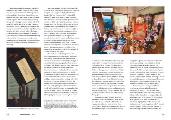 Recent bio-medical analyses of collections are currently being performed in ethnographic museums using the same equipment deployed for human beings . This new “ inner voyage ” reveals initial knowledge about quasi digestive tracts carved or incised into solid wood by the artist , providing small ducts to be filled with content by a shaman or priest . I would argue that this is an infringement of ethical and intellectual rights for which the museum is to be held responsible . It cannot own the sole rights for reproduction ! For indeed , ethnographic collections can be read as a library of organs , the vital matter , so to speak , of Black lives , and are significant repositories that need to inform decolonial practices , from art to design and engineering , and their respective epistemologies . Sadly , most , if not all museums , hinder physical access to their collections , thereby denying contemporary remediation and defining the conservationist role of the custodian or curator more than ever before .