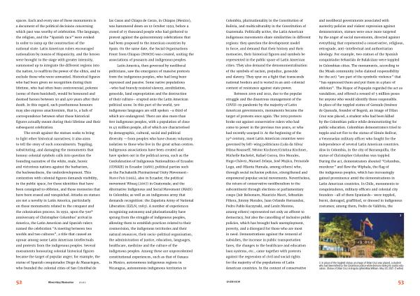 The revolt against the statues seeks to bring to light other historical narratives ; it also aims to tell the story of such concealments . Toppling , substituting , and damaging the monuments that honour colonial symbols calls into question the founding narrative of the white , male , heroic and victorious nations against the barbarism , the backwardness , the underdevelopment . This contention with colonial figures demands visibility , in the public space , for those identities that have been consigned to oblivion , and those memories that have been erased and vanquished . Attacks on statues are not a novelty in Latin America , particularly on those monuments related to the conquest and the colonisation process . In 1992 , upon the 500 th anniversary of Christopher Columbus ’ arrival in America , the Latin American and Spanish rulers named the celebration “ A meeting between two worlds and two cultures ”, a title that caused an uproar among some Latin American intellectuals and protests from the indigenous peoples . Several monuments honouring colonial historical figures became the target of popular anger ; for example , the statue of Spanish conquistador Diego de Mazariegos , who founded the colonial cities of San Cristóbal de las Casas and Chiapa de Corzo , in Chiapas ( Mexico ), was hammered down on 12 October 1992 , before a crowd of 15 thousand people who had gathered to protest against the quincentenary celebrations that had been proposed to the American countries by Spain . On the same date , the Social Organisations Front from Chiapas ( FOSCH ) was created , uniting the associations of peasants and indigenous peoples .